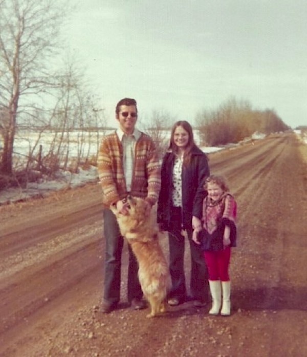 On a country road near the farm, Jim with Dianne, Lily and Sam, about 1974.