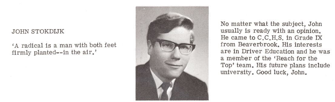 Lynn Wright wrote “Never cease to disagree, John.” Remembering Lynn, I remember an incident from grade 11 algebra class. Lynn was cute and I liked talking to her. One class after receiving back a test, I was completely turned around in my desk chatting with Lynn, who sat behind me. The teacher, Mrs. Withrow, stomped across the room shouting “John Stokdijk, unless you made 100% in your test you have no business sitting there talking”. I ignored her “What did you make in your test?” she demanded. 100%, which was true, I replied. The class roared, the teacher was dumbfounded but I had to turn around anyways.