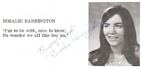 I dated Rosalie Harrington a few times after high school, during the winter of 1968-69 if I remember correctly. I remember going skating with her at the Stadium on Friday evenings and that the tune Alley Cat was always played. I remember other wonderful evenings at her home in Glenholme where I learned to play the card game Hearts. I remember that her grandmother was extremely sharp at that game. Her father was a customer at the Bank of Nova Scotia where I was working as a teller. For some time after Rosalie and I decided to stop dating, he continued to seek me out at the bank and invite me to Glenholme to play cards. I got the impression that he was disappointed that Rosalie and I were not becoming a couple. If I remember correctly, Rosalie was working with developmentally disabled people and had a talent for that very difficult type of work. I have never heard anything about her since leaving Nova Scotia in 1969 and can now only wonder how her life has been.